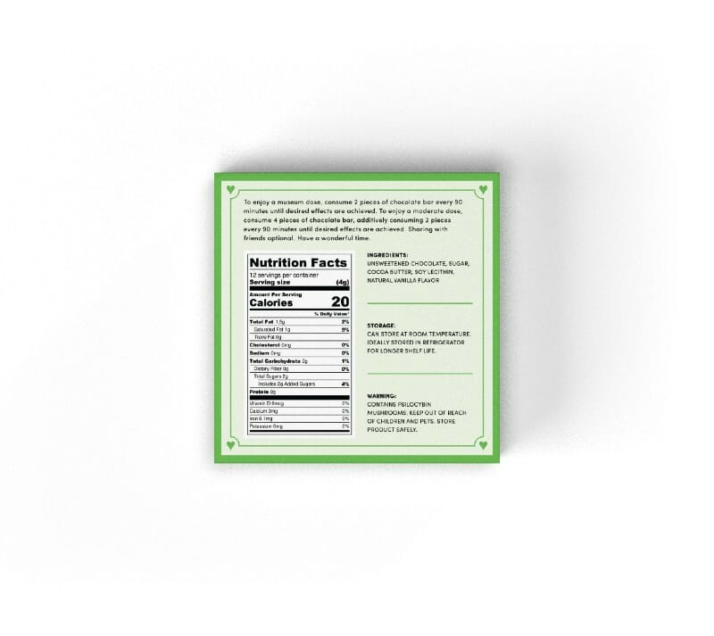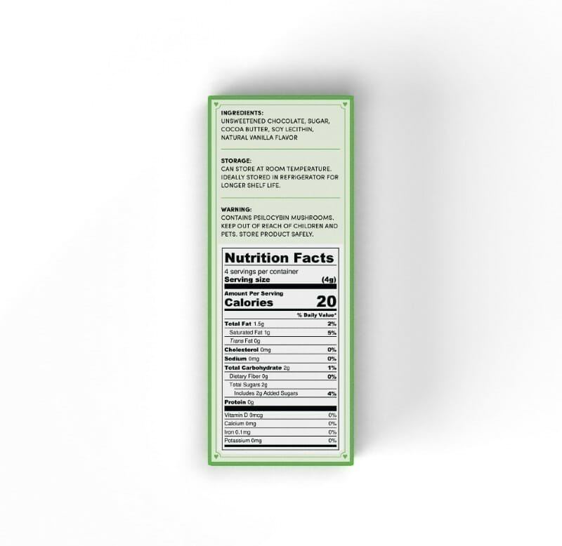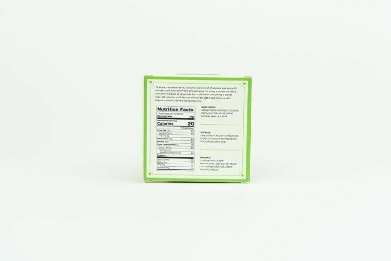 This chocolate bar is a convenient option for consuming psilocybin. Each piece contains a precise amount so you can manage your intake. For improved focus and mood, try half or one square. For visual hallucinations, consume three or more squares.